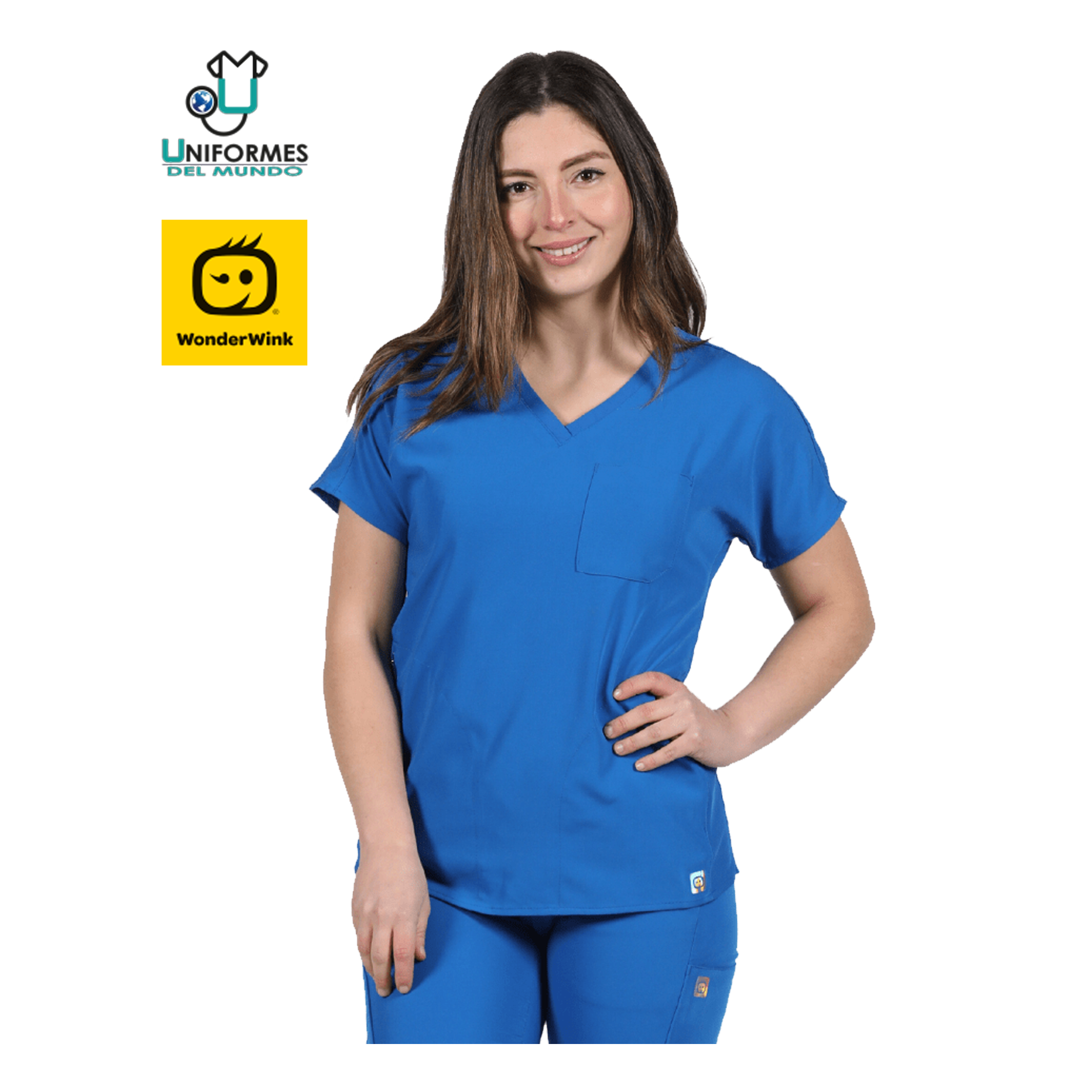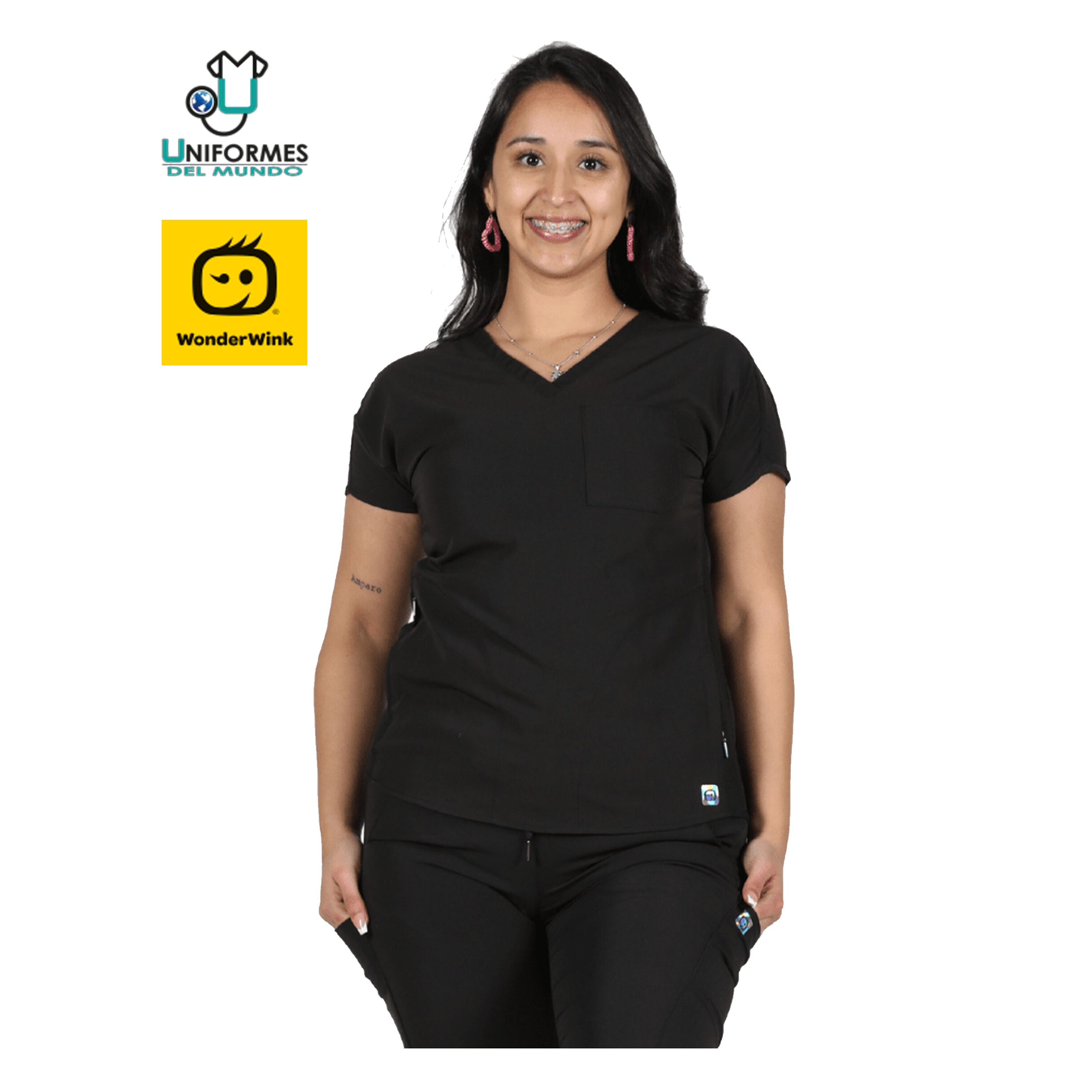 Polera de ajuste moderno, diseñada para combinar estilo y funcionalidad. Con un elegante escote en V y mangas dolman, este modelo incluye una presilla para insignia en el hombro, añadiendo un toque profesional. El bolsillo en el pecho izquierdo proporciona un espacio práctico, mientras que los dos bolsillos laterales con cierre ofrecen seguridad para tus pertenencias. Un pliegue trasero facilita el movimiento, complementado por una espalda curvada más larga que realza la silueta.